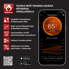 - Seuraa saunasi toimintaa etänä maksuttomalla MyHarvia 2 -sovelluksella – näet lämpötilan, kosteuden ja saunan käytön (PIR-liiketunnistin) sekä voit tarkistaa, milloin sauna on valmis (toimii myös puulämmitteisissä saunoissa)